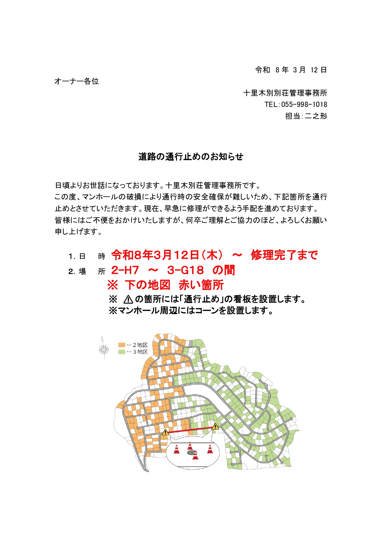 日 時 令和8年3月12日(木) ~ 修理完了まで 場 所 2-H7 ~ 3-G18 の間 ※ 下の地図 赤い箇所 ※ ⚠の箇所には「通行止め」の看板を設置します。 ※マンホール周辺にはコーンを設置します。