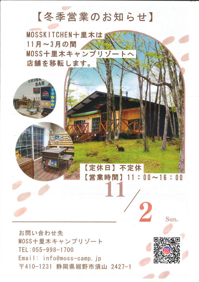 冬季営業の期間はMOSS十里木キャンプリゾート内にてMOSSKITCHEN十里木を開店しています。