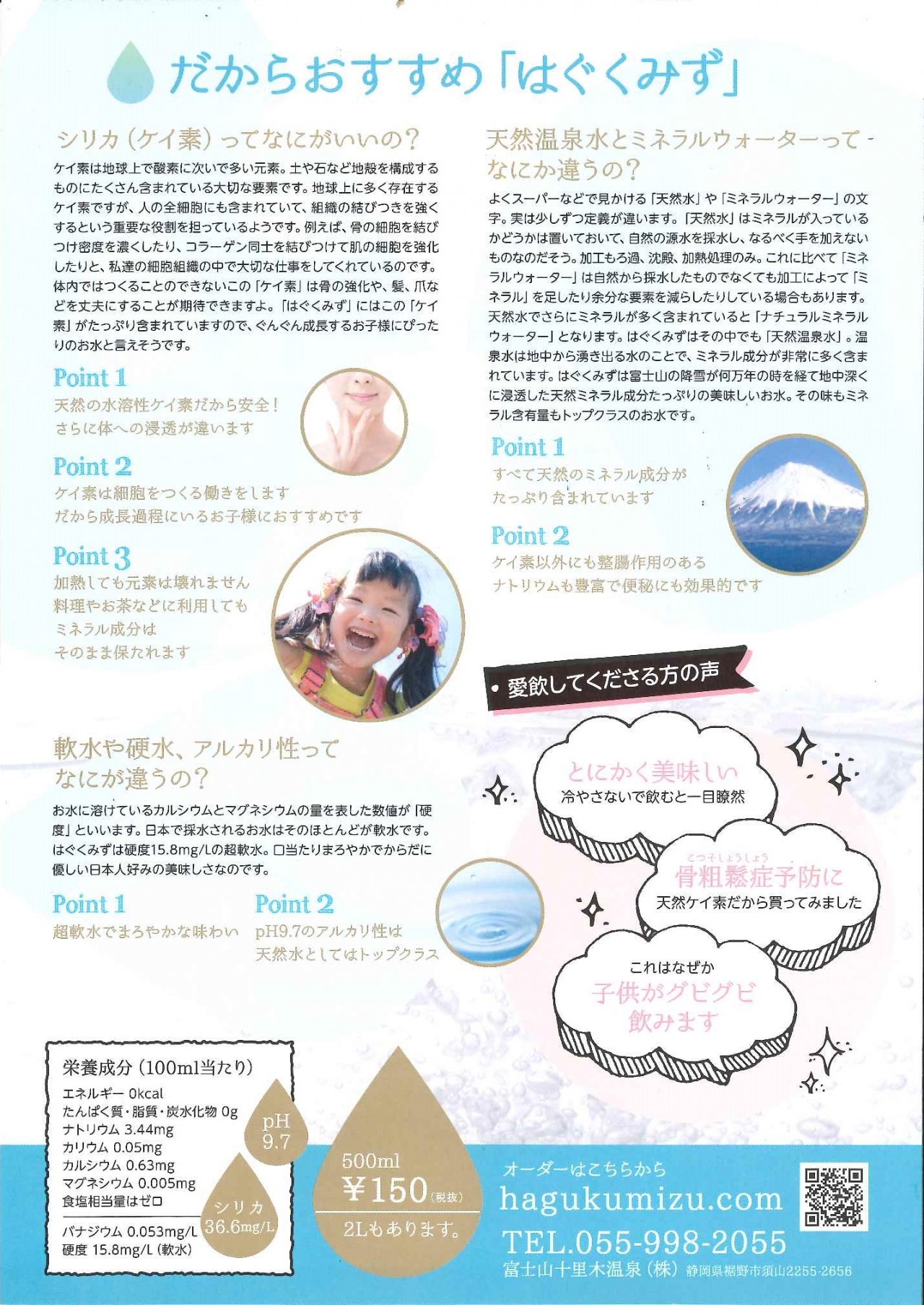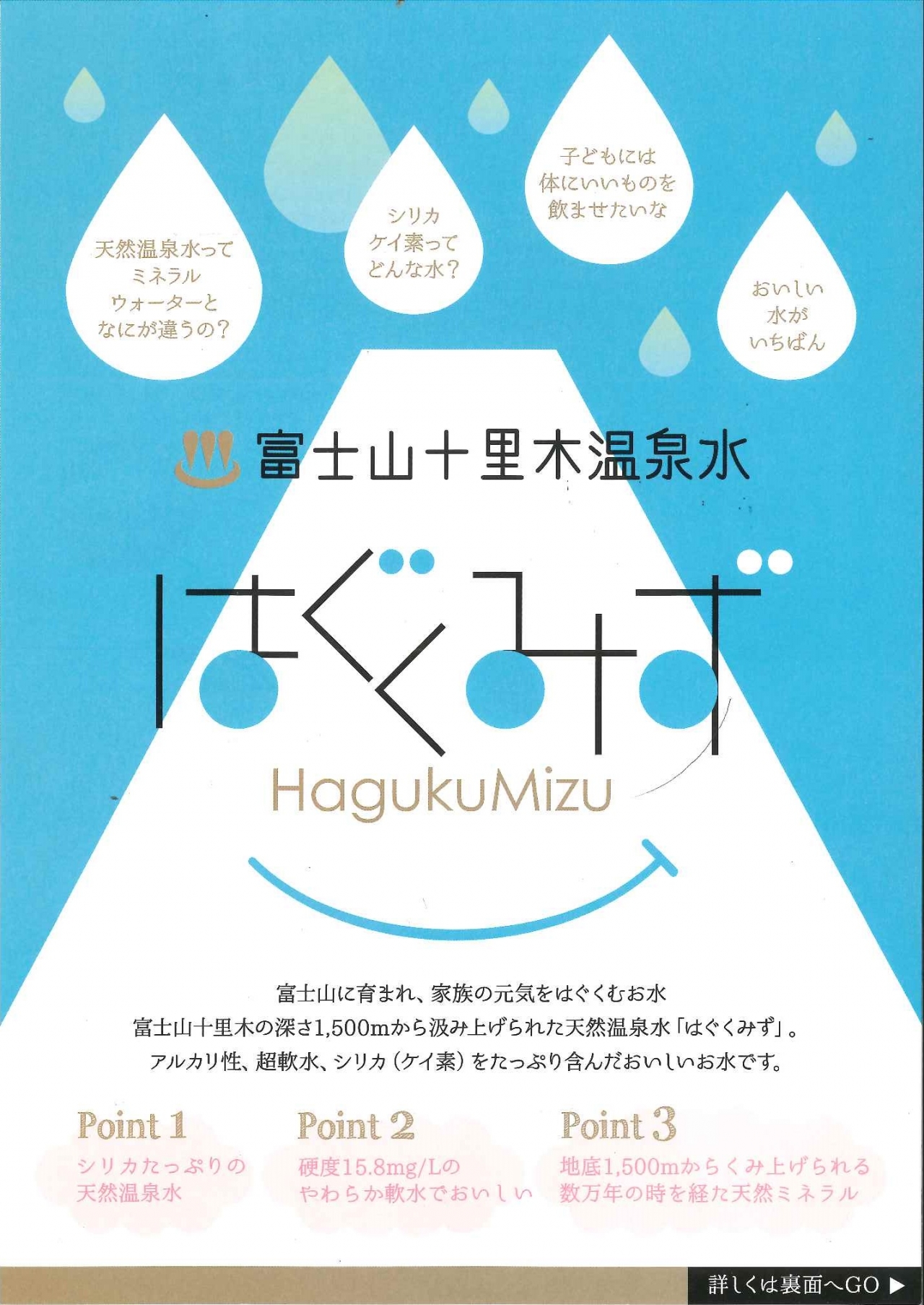数万年の時を経て地下1500mまで浸透した太古の泉の富士山天然温泉は、数多くの天然ミネラルが蓄積され、美容と健康に及ぼす影響は計り知れないものがあります。この富士山天然温泉は、人の全細胞にも含まれている「ケイ素」が豊富に含まれており、組織の結びつきを強くする重要な役割を担っています。ぐんぐん成長するお子様にぴったりのお水といえるでしょう。