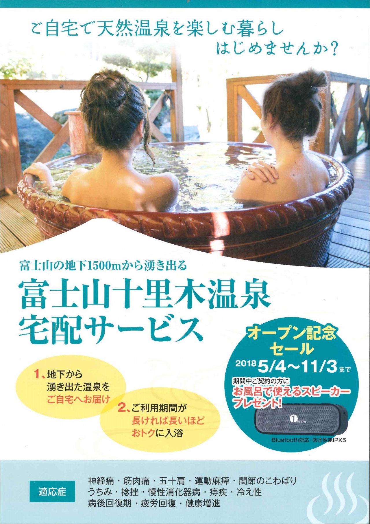 この『富士山十里木天然温泉』は、富士山が世界文化遺産として登録された後には初めて認可された富士山(標高900m/約0.6合目 地底1500m)を源とをする温泉です。井戸には特殊なグラスファイバー管を用いて1500m付近の温度(約40℃)や、温泉成分(豊富なミネラル)を維持できるよう汲み上げております。それだけでも十分に珍しく希少価値の高い源泉かと思われますが、富士山が世界遺産となってしまった今後は富士山を構成する山麓周辺での温泉掘削は、環境保全や開発規制の為に静岡・山梨両県ともに大変難しいものと思われます。よって時を重ねるごとにその価値を増してゆく貴重な源泉であると弊社は考えます。