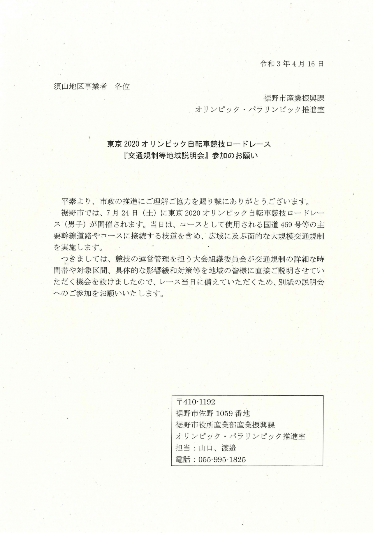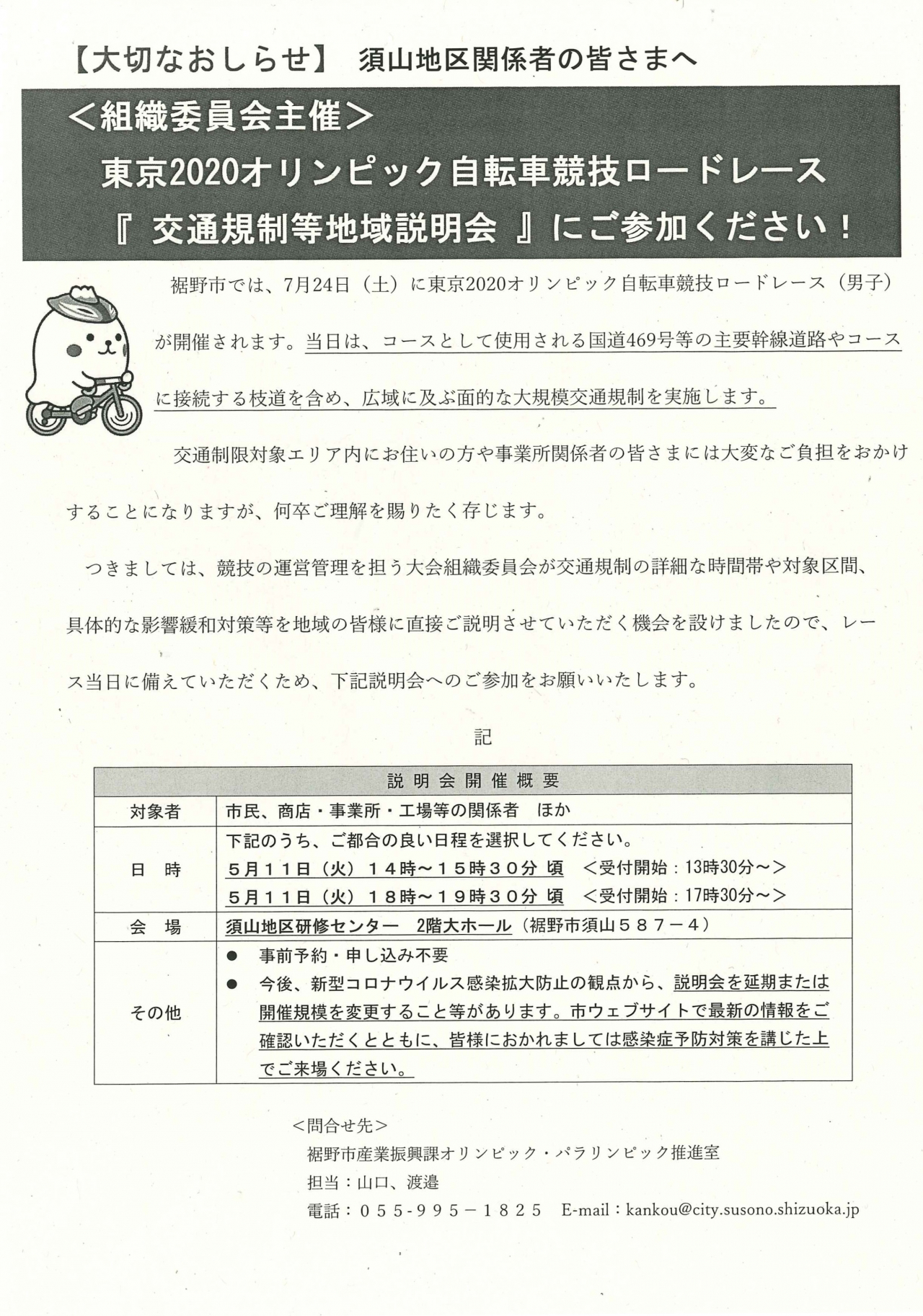 裾野市産業振興課オリンピック・パラリンピック推進室から自転車競技ロードレースによる交通規制説明会のお知らせです。