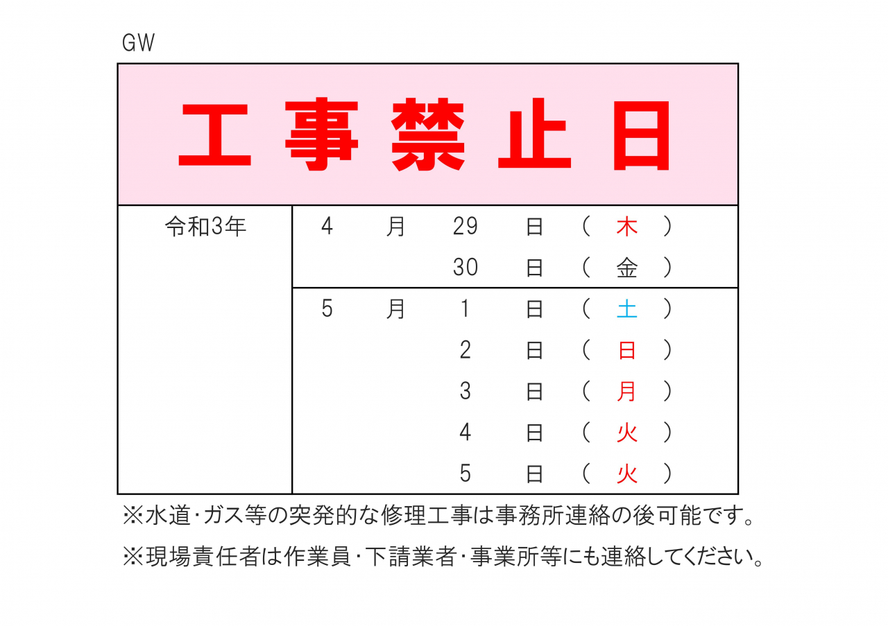 4月29日(木)から5月5日(火)は工事禁止日となります。