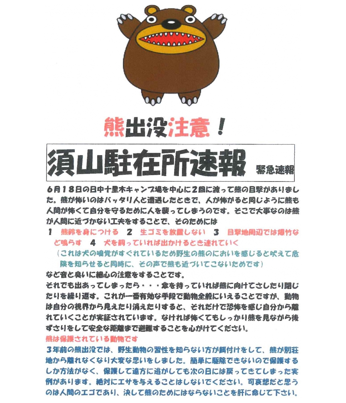 近隣でクマの目撃情報があります。