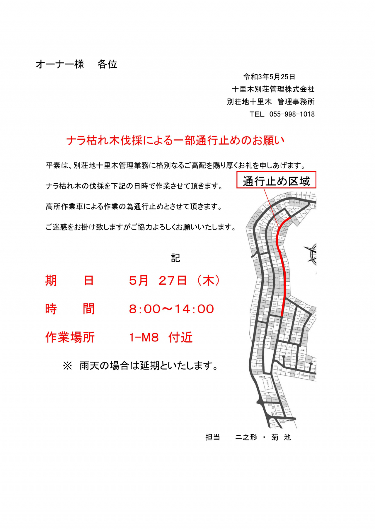 ナラ枯れ木伐採による一部通行止めのお知らせ