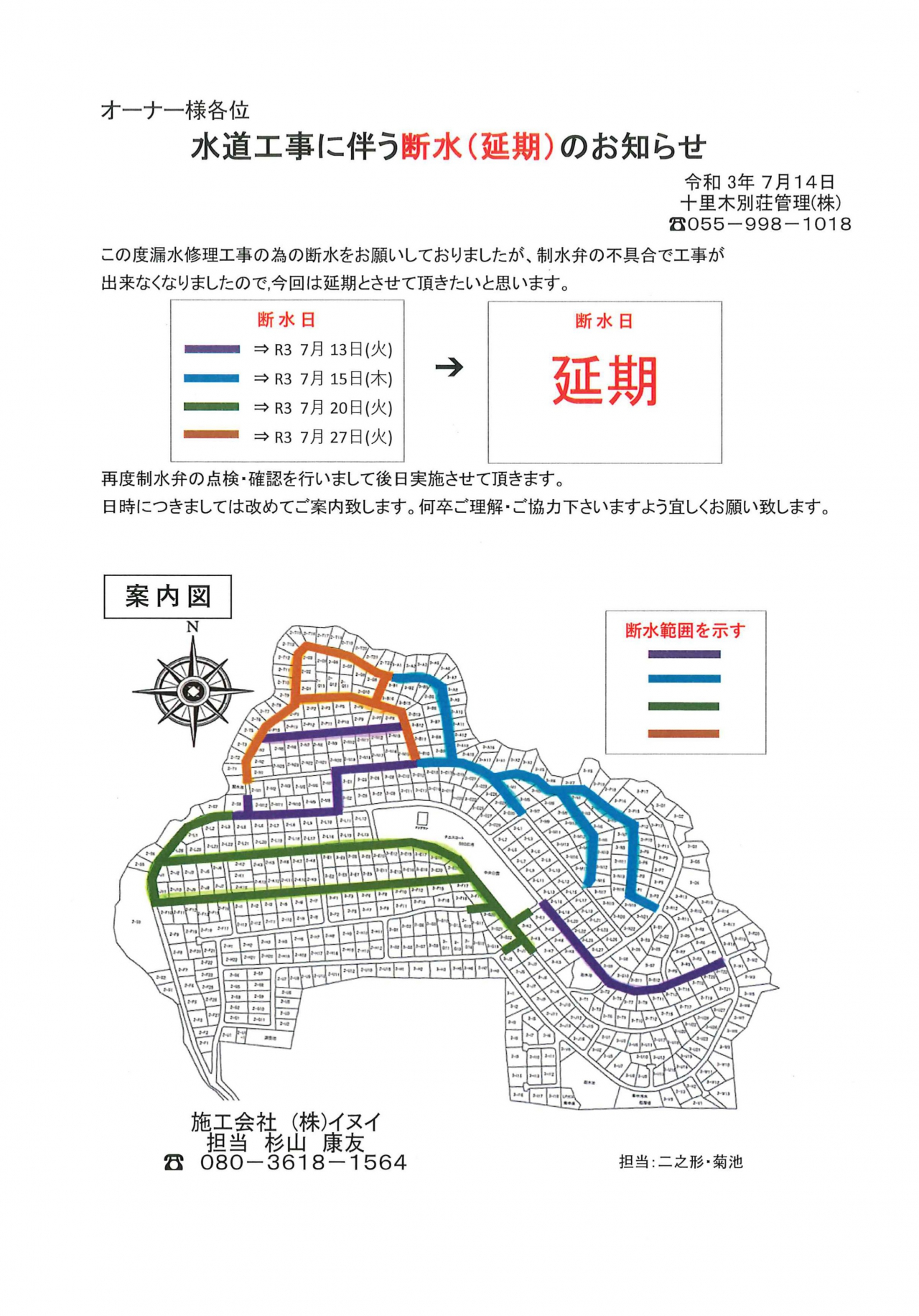 7月13日(火)から漏水修理工事作業を実施する予定でしたが、制水弁の不具合で工事が出来なくなりましたので、今回は延期とさせていただきます。日時につきましては改めてご案内いたします。何卒、ご理解・ご協力のほどよろしくお願いいたします。